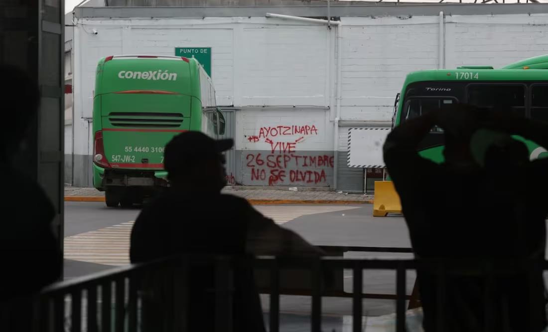 Dentro de la central, manifestantes pintaron la frase: "Ayotzinapa vive, 26 de septiembre no se olvida". A pocos días del undécimo aniversario de la desaparición de 43 estudiantes normalistas.
