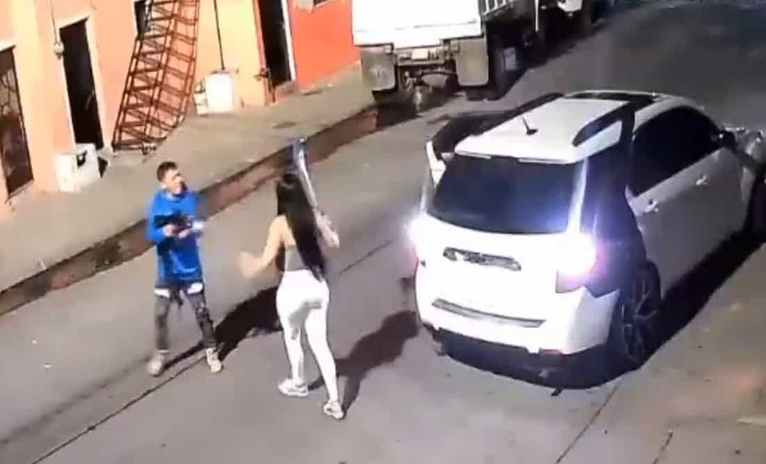 En las imágenes, se observa cómo el atacante espera afuera del domicilio de Carla y la llama. Ella sale, lo confronta y, con una escoba, golpea los cristales del vehículo.