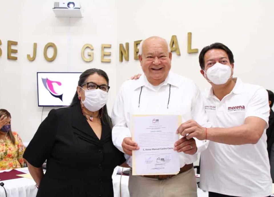 Tras recibir su constancia, Castro Cosío estuvo acompañado por el líder nacional de Morena, Mario Delgado, quien celebró el triunfo y sostuvo que será el de BCS un gobierno honesto.