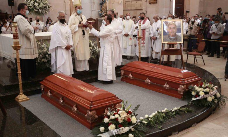 Al frente del atrio fueron colocados los dos féretros en diagonal con los cuerpos de los sacerdotes jesuitas y junto a cada uno se colocó su foto.