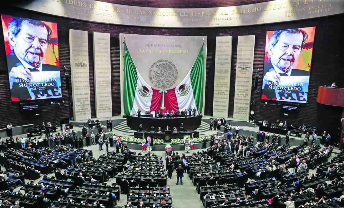 Al centro del Palacio Legislativo fue colocado el ataúd de Muñoz Ledo arropado por la Bandera Nacional, así como por dos fotos que recordaban los debates memorables que protagonizó como legislador durante 32 años.