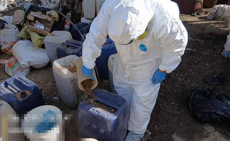 En Michoacán, en La Escondida, se localizó y desmanteló un laboratorio, se aseguraron nueve mil 700 litros y 500 kilos de precursores químicos, además de equipo de laboratorio y herramientas.