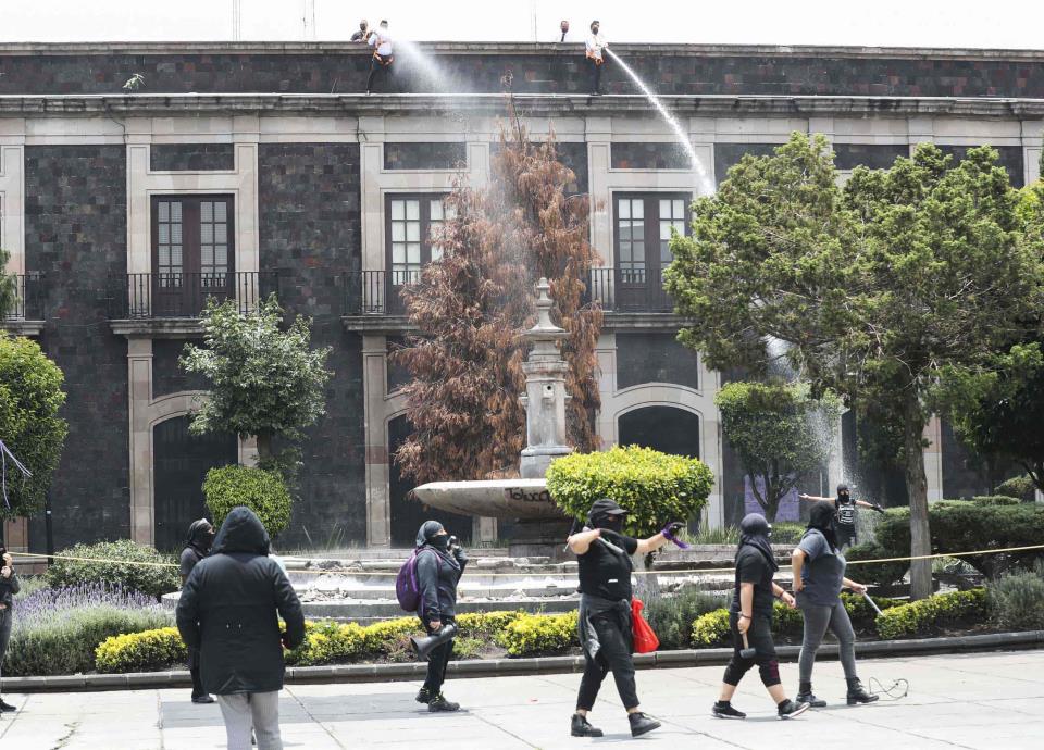 Desde el techo, trabajadores lanzaron chorros de agua con mangueras para disuadir a las feministas.