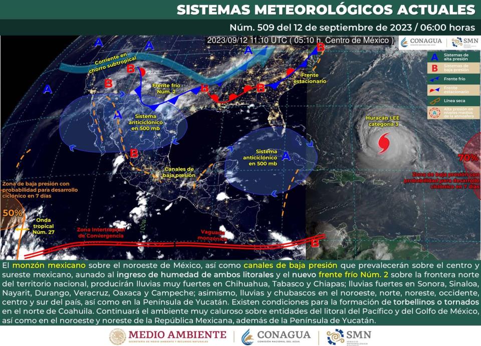 CIUDAD DE MÉXICO.- De acuerdo con el pronóstico del clima del Servicio Meteorológico Nacional, este martes 12 de septiembre continuará el monzón mexicano sobre el noroeste de México, así como canales de baja presión que prevalecerán sobre el centro y sureste mexicano, aunado al ingreso de humedad de ambos litorales y el nuevo frente frío número 2