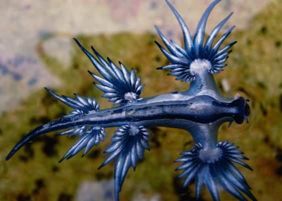De acuerdo con información de la Secretaría de Medio Ambiente y Recursos Naturales (Semarnat) el dragón azul es una babosa marina de pequeño tamaño y color azul eléctrico que flota en la superficie del mar boca arriba, gracias a una bolsa de aire que le permite desplazarse con las corrientes.
