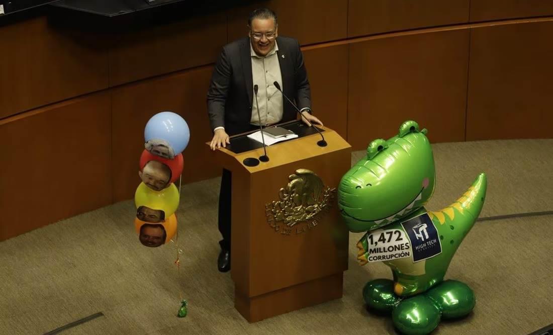 El senador por Morena, Gabriel Hernández, exhibió una botarga-dinosaurio verde dijo recibió contratos por 1,472 millones de pesos.