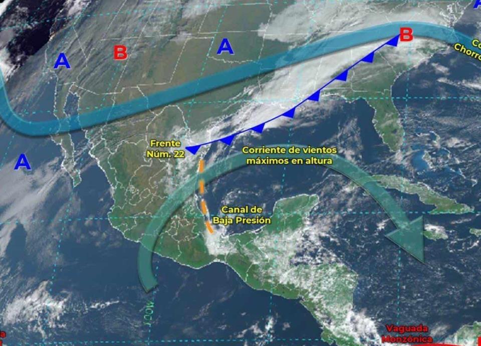 Lluvias, vientos y oleaje serán generados por el sistema frontal número 22 que se desplazará sobre el noreste de la República Mexicana, canales de baja presión extendidos por diferentes regiones del país, la corriente en chorro subtropical, una corriente de vientos máximos y la entrada de humedad proveniente del Océano Pacífico, Golfo de México y Mar Caribe.