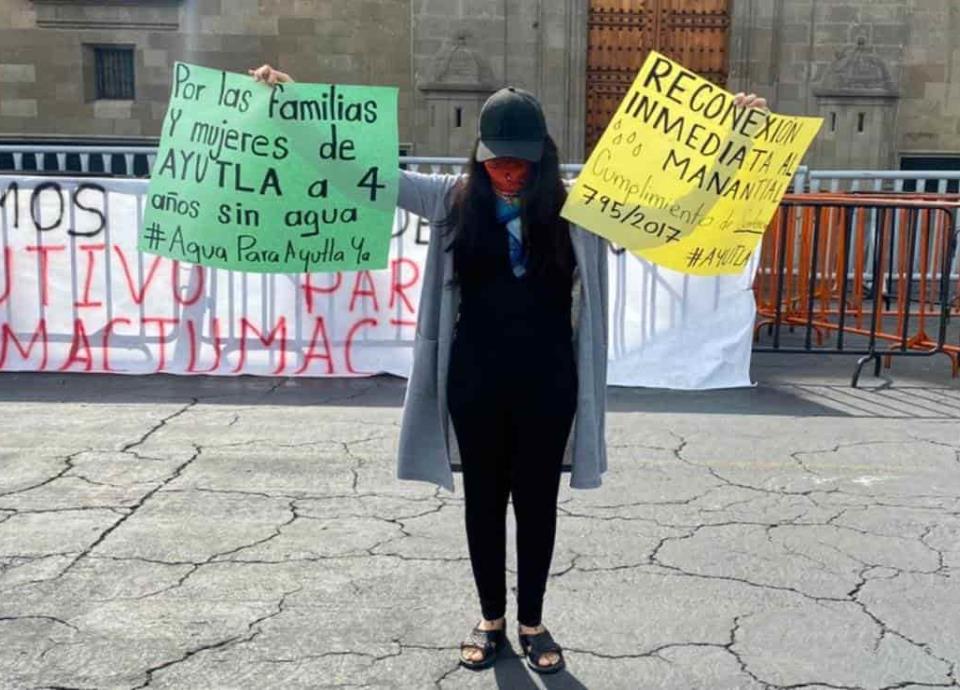 Portando dos cartulinas con mensajes como "Reconexión inmediata al manantial, cumplimiento de la sentencia 795/2017" y "Por las familias y mujeres de Ayutla a 4 años sin agua", la joven mixteca se manifestó sobre el caso de San Pedro y San Pablo Ayutla, comunidad ayuujk de la Sierra Norte de Oaxaca que tras cuatro años de batalla legal obtuvo una sentencia definitiva para ser reconectada al manantial que les fue despojado en junio de 2017.
