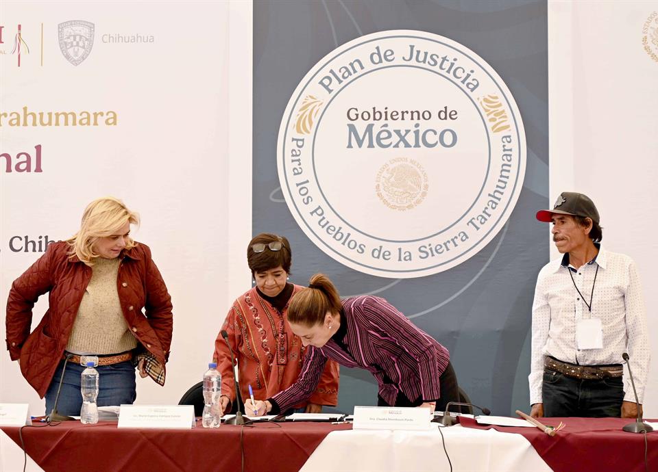 Sheinbaum Pardo estuvo acompañada por funcionarios federales, autoridades tradicionales indígenas y la gobernadora de Chihuahua, María Eugenia Campos Galván, durante la firma del decreto presidencial mediante el cual se restituyen tres mil hectáreas de tierra a la comunidad ódami de Malanoche, como parte del Plan de Justicia para los Pueblos de la Sierra Tarahumara.