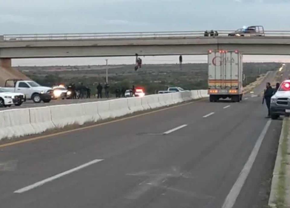 De acuerdo a los reportes de seguridad, la mañana de este sábado, los automovilistas que circulaban por ese lugar, ubicado a la altura de la comunidad Rancho Grande que conduce al municipio de Cañitas de Felipe Pescador, reportaron al número de emergencias 911 que en ese puente vehicular yacían colgados tres cuerpos.