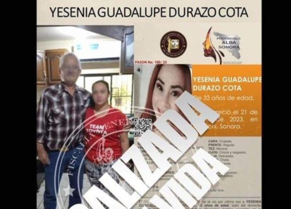 HERMOSILLO, Son., mayo 25 (EL UNIVERSAL).- Yesenia Guadalupe Durazo Cota, integrante del colectivo Madres Buscadoras de Sonora, fue localizada con vida, se encuentra sana y a salvo, informó la Fiscalía General de Justicia del Estado (FGJE).