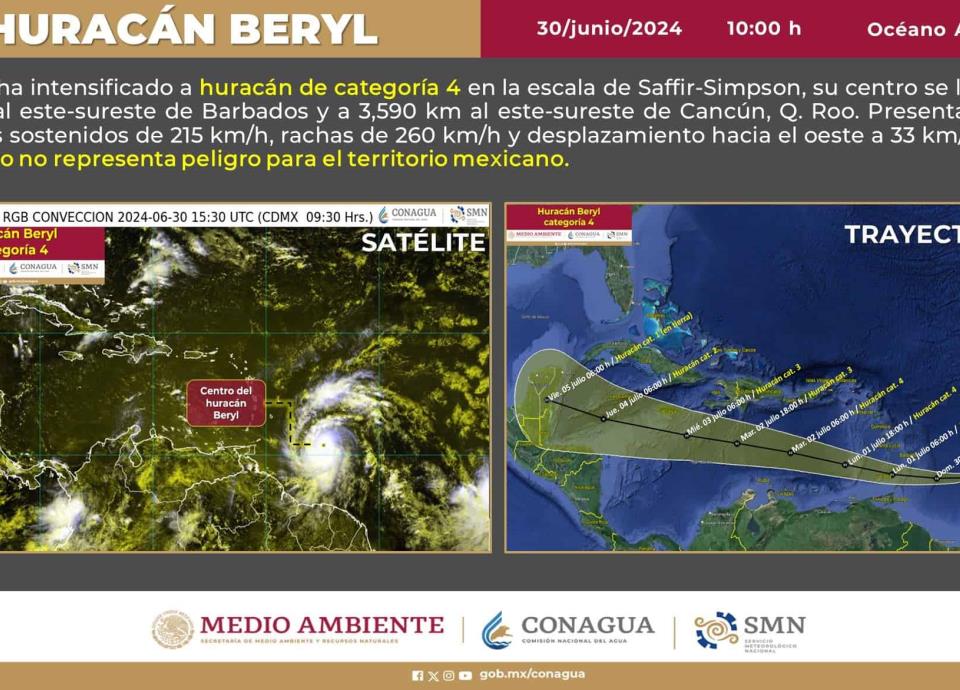 De acuerdo con el último reporte emitido por la dependencia, el centro de Beryl se localiza a 575 kilómetros al este-sureste de Barbados y a 3 mil 590 kilómetros al este-sureste de Cancún, Quintana Roo.