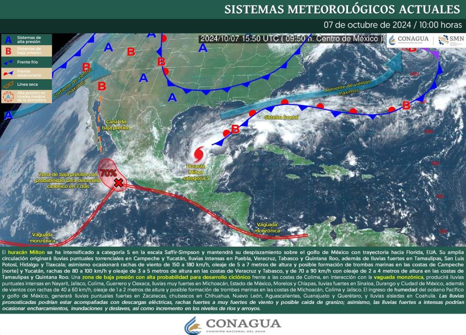 Según el último reporte de la Comisión Nacional del Agua (Conagua), el huracán presenta vientos máximos sostenidos de 255 km/h, con rachas que superan los 300 km/h. Actualmente, "Milton" se localiza a unos 160 kilómetros al noroeste de Celestún y a 200 kilómetros al oeste de Progreso, ambos en el estado de Yucatán.