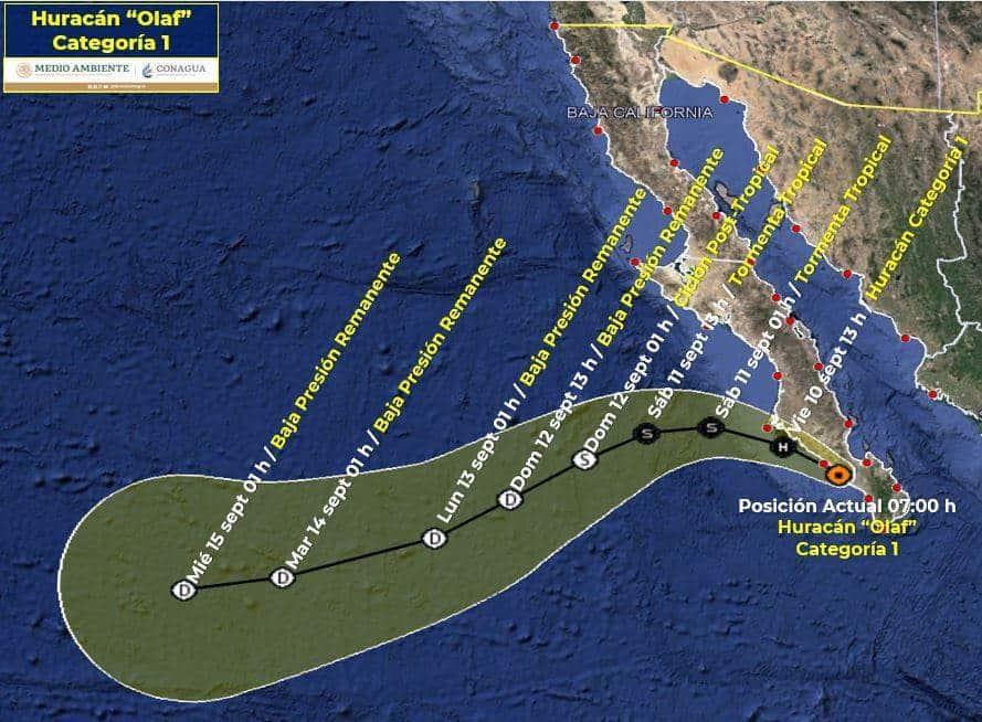 CIUDAD DE MÉXICO.- La Comisión Nacional del Agua (Conagua) informó que a las las 04:00 horas, tiempo del centro de México, "Olaf" salió al Océano Pacífico y su centro se localizó aproximadamente a 70 kilómetros al suroeste de La Paz, Baja California Sur. Se mantiene como huracán categoría 1 en la escala Saffir-Simpson, con vientos máximos sostenidos de 140 km/h y rachas de 165 km/h.