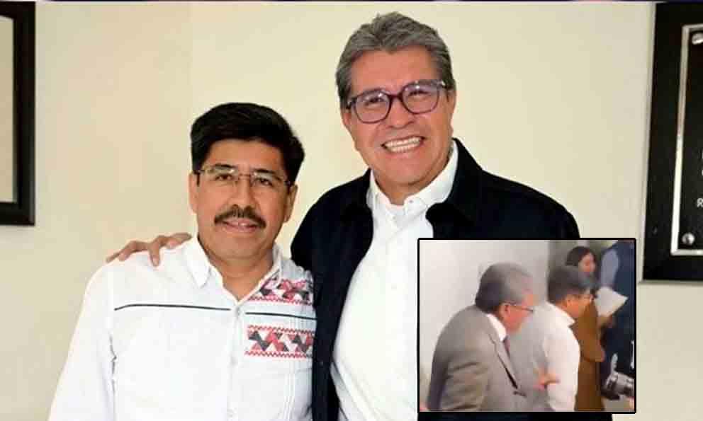 Según se aprecia en la escena, cuando Aguilar Ortiz salió por una puerta y buscó seguir caminando por en frente de las cámaras, Monreal Ávila lo tomó del brazo y jaló con firmeza para que permaneciera en el lugar.