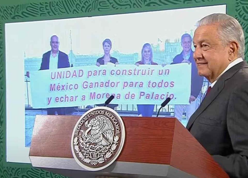 En el Salón Tesorería, el Presidente exhibió una imagen en la que aparece Claudio X. González, Gustavo de Hoyos, la periodista y política Beatriz Pagés, y Argelia Núñez, directora de Poder Inspira Poder, quienes portan una manta con la leyenda: "UNIDAD para construir un México Ganador para todos y echar a Morena de Palacio".