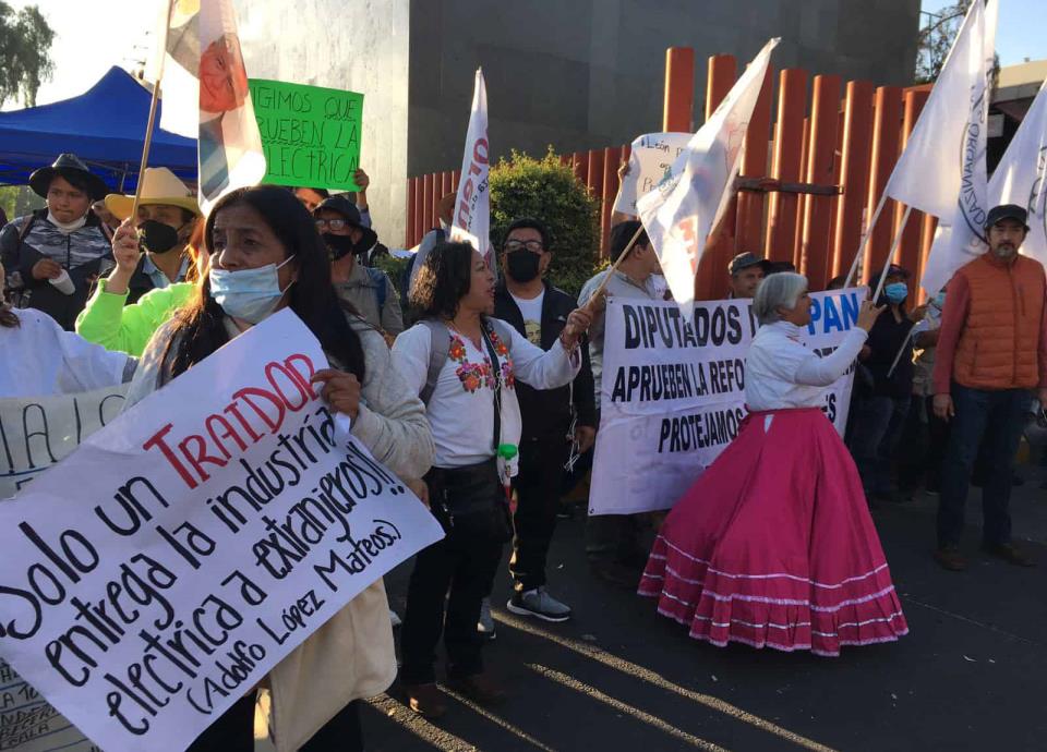 "¡Es un honor, estar con Obrador!", "¡Energía gratuita, lo que el pueblo necesita!", "¡No estás solo, no estás solo!", son algunas de las consignas que lanzan los manifestantes cuando llegan algunos funcionarios del Palacio Legislativo.