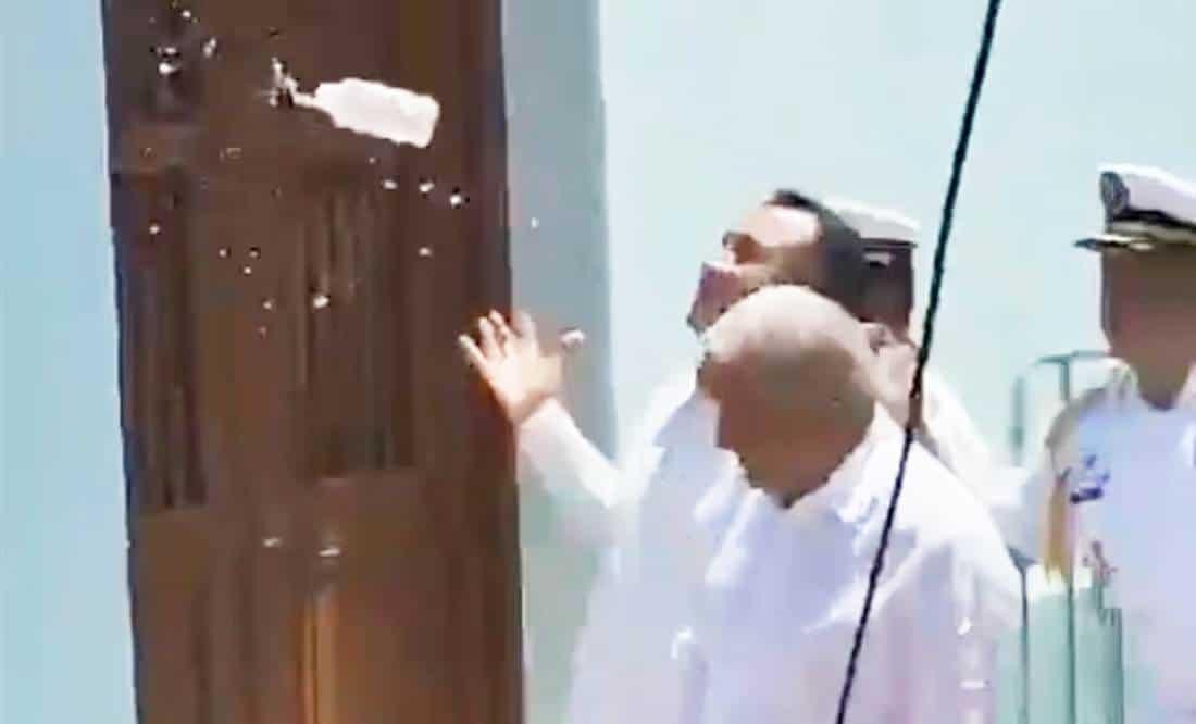 Sin embargo, un video mostró a López Obrador esquivando una botella mientras ingresaba al recinto acompañado del gobernador Cuitláhuac García y el secretario de la Marina, José Rafael Ojeda Durán.