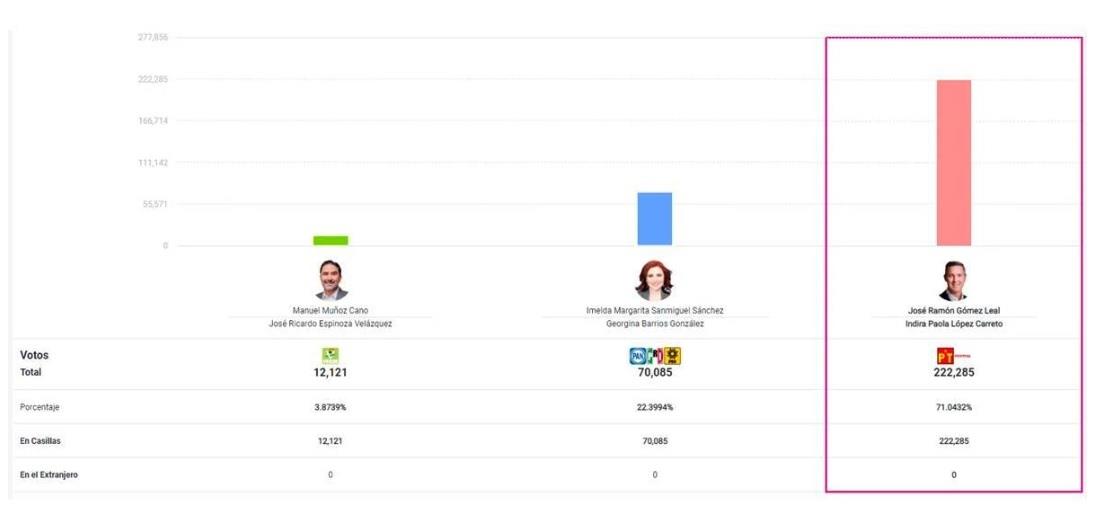 En un lejano segundo lugar se ubica Imelda Sanmiguel Sánchez, de la coalición PAN-PRI-PRD, con el 22 por ciento de los sufragios, y en tercer sitio está el abanderado del Partido Verde, Manuel Muñoz Cano, con apenas el 3.87 por ciento de los votos.