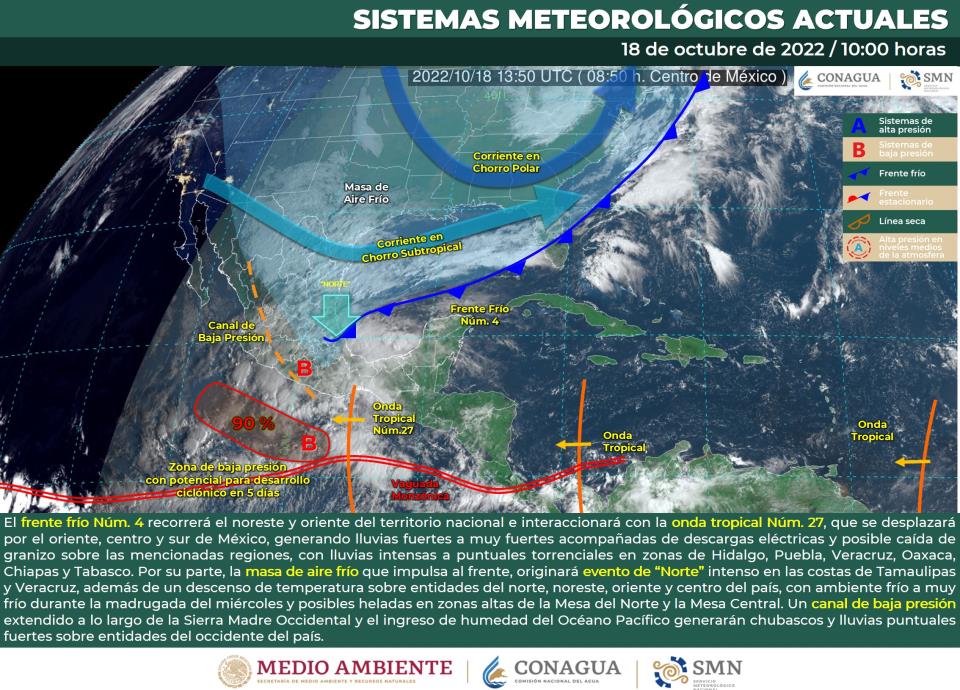 El Frente Frío No. 4 y la Onda Tropical No. 27 provocarán lluvias torrenciales en Oaxaca, Puebla y Veracruz.