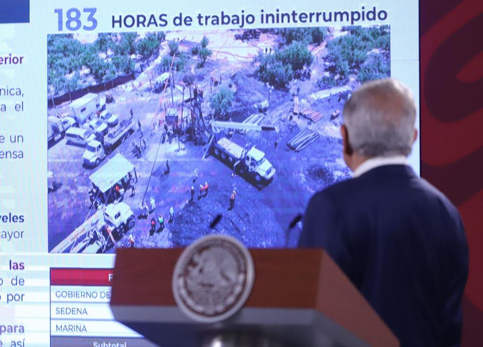 Durante la conferencia de prensa de este lunes en Palacio Nacional, la titular de Protección Civil mencionó al presidente Andrés Manuel López Obrador que se trabaja en conjunto con Conagua, Pemex, IMSS, el gobierno de Coahuila y mineros voluntarios para "lograr el objetivo de sacar a nuestros mineros que se encuentran en la mina 'Pinabete' y esperemos sea el día de hoy, señor presidente".