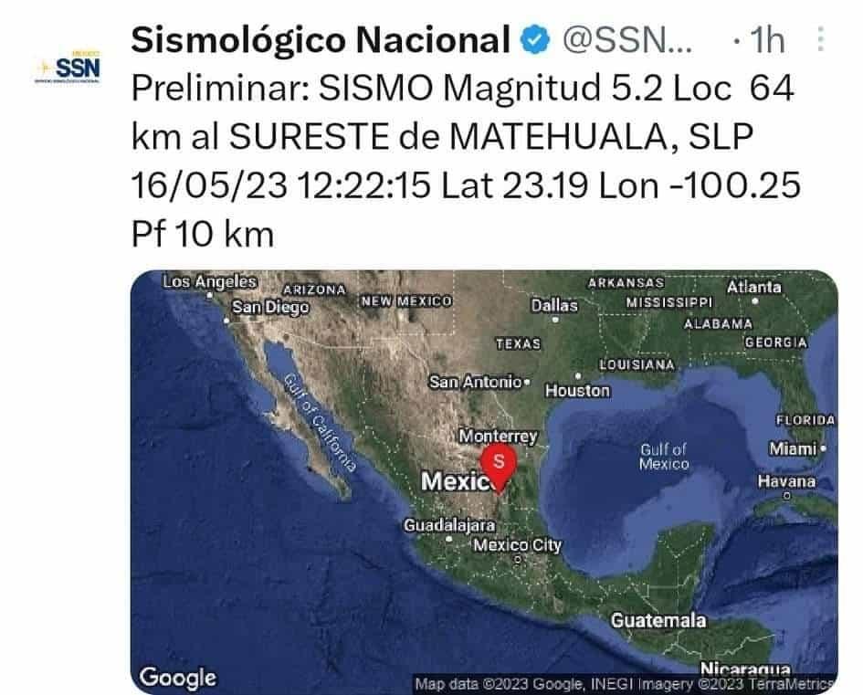 CIUDAD DE MÉXICO, mayo 16 (EL UNIVERSAL).- El Servicio Sismológico Nacional reportó un sismo de magnitud 5.0 en Cerritos, San Luis Potosí a las 12:22 de la tarde de este martes.