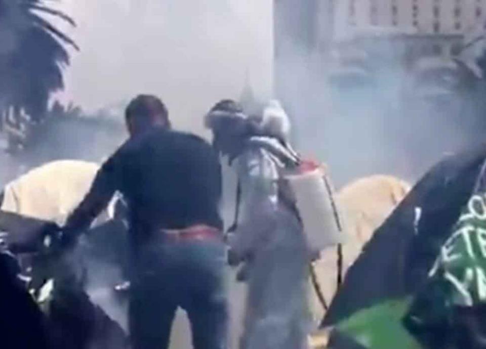 A las 13:30 horas, un hombre se colocó una mascarilla, un traje especial y tomó una máquina para sanitizar toda la avenida Juárez —donde se ubica el plantón—, así como las casas de campaña donde permanecen los detractores de López Obrador.