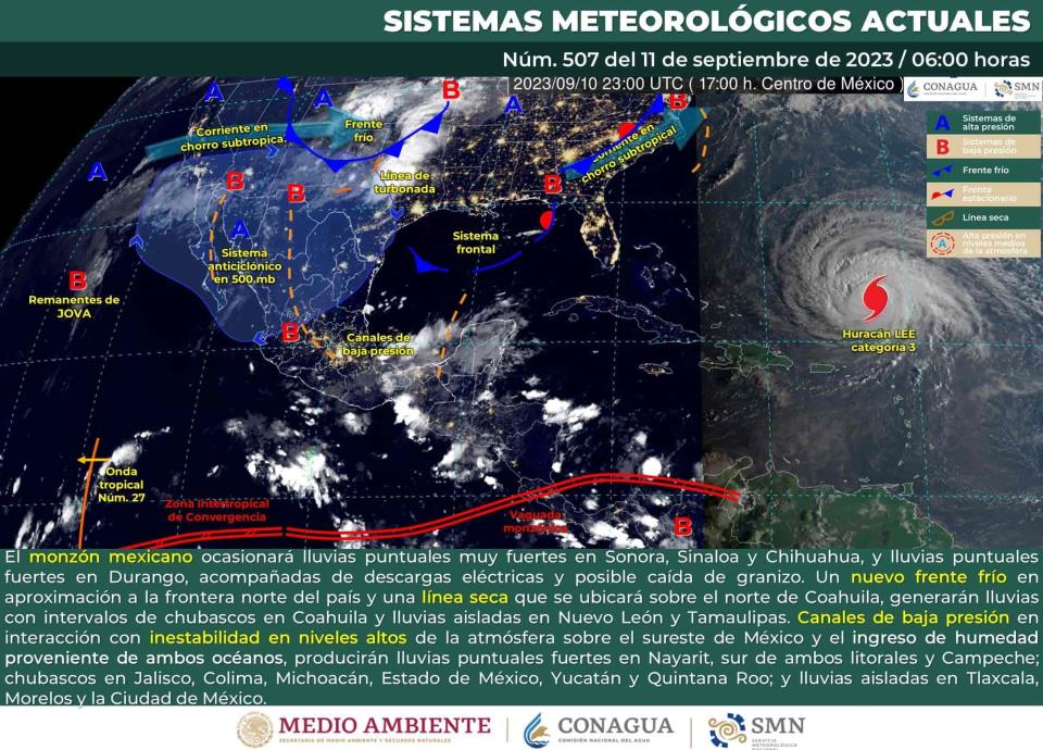 CIUDAD DE MÉXICO.- Este lunes 11 de septiembre, el monzón mexicano ocasionará lluvias puntuales muy fuertes en Sonora, Sinaloa y Chihuahua y lluvias