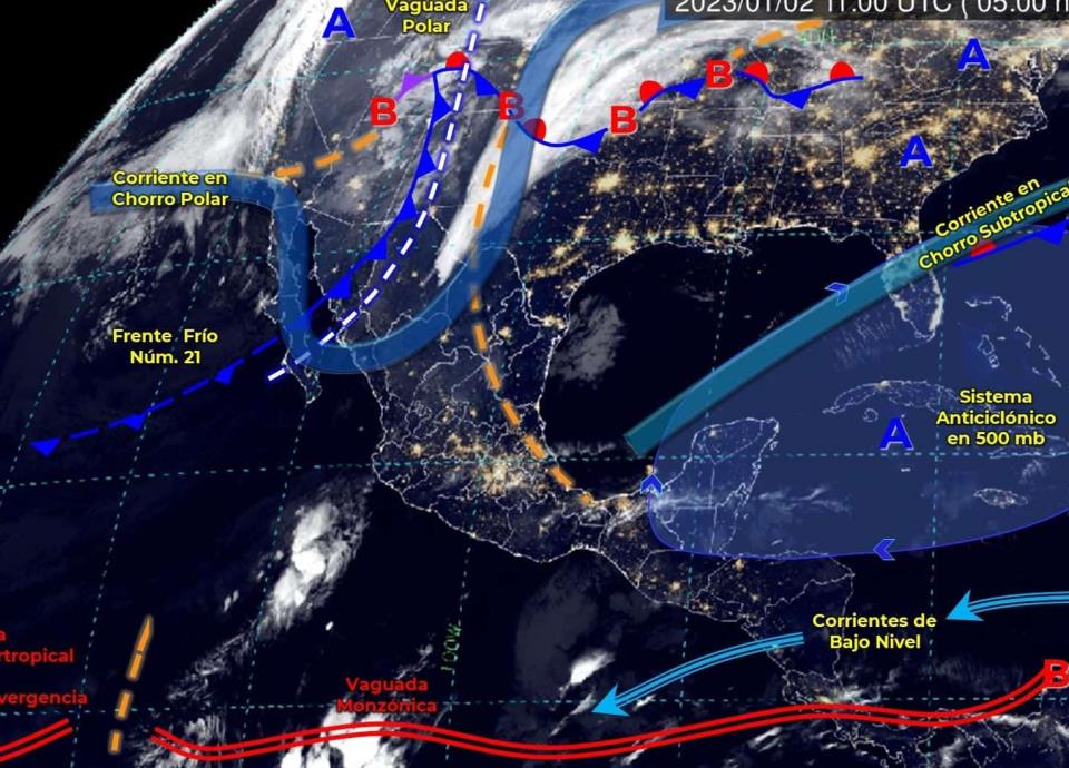 De acuerdo con el reporte del Servicio Meteorológico Nacional de Conagua, este lunes 2 de enero, hay probabilidad de lluvias puntuales fuertes en Sonora y chubascos en Baja California y Chihuahua, con posible caída de aguanieve o nieve en sus zonas serranas, así como rachas de vientos fuertes a muy fuertes y ambiente matutino frío a gélido en los estados del noroeste y norte del territorio mexicano.