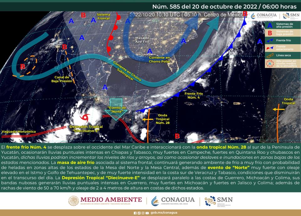 CIUDAD DE MÉXICO.- El Servicio Meteorológico Nacional prevé que la depresión tropical "Diecinueve-E" evolucione a tormenta tropical hoy, jueves 20 de octubre 2022, en el océano Pacífico, en las costas de México.
