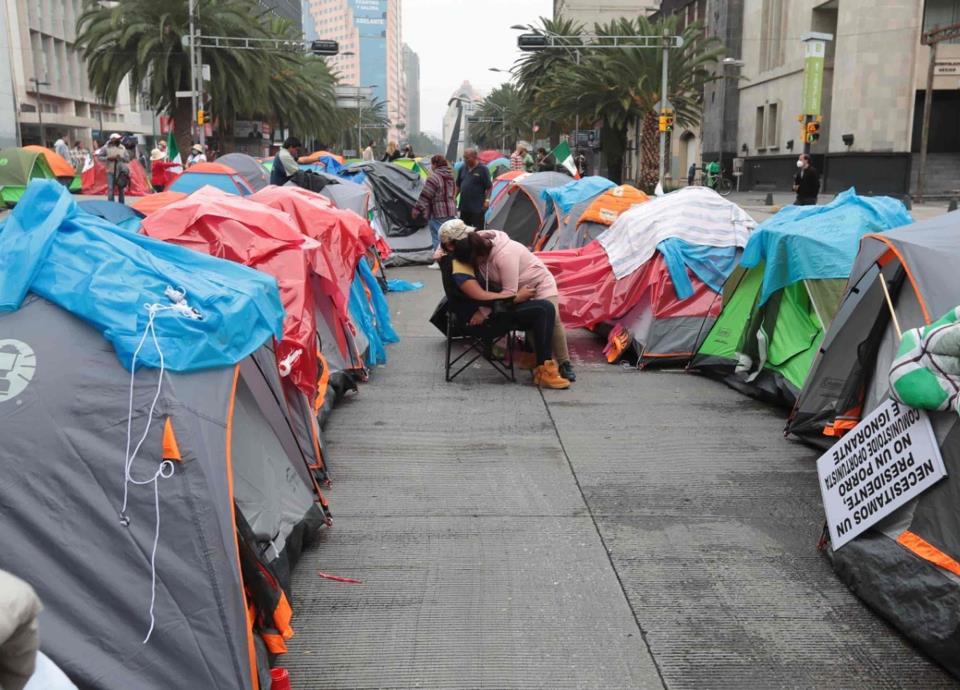 CIUDAD DE MÉXICO/EL UNIVERSAL.- Durante la noche de este lunes, jóvenes en situación de calle quisieron entrar en algunas de las casas de campaña desocupadas en el plantón del Frente Nacional Anti-AMLO (FRENAAA), por lo que algunos de los líderes para evitar confrontaciones se las obsequiaron. Antes de que esto pasara se desató un conato de riña, pues cuando los jóvenes comenzaban a desarmar las casas para llevárselas, otros integrantes de FRENAAA los confrontaron pidiendo que las dejaran en su lugar, ya que serían ocupadas más tarde, además de que ellos no cooperaron en su adquisición. La discusión y los jaloneos duraron unos minutos y tuvieron que intervenir algunos de los elementos policiales que resguardan la manifestación, fue hasta que uno de los líderes de los grupos que hay en el plantón se las obsequió. Posteriormente uno de los coordinadores del campamento pidió a los manifestantes que evitaran las confrontaciones con los jóvenes en situación de calle, recalcando evitar esas acciones cuando se encuentren los medios de comunicación presentes en el plantón. Y es que en un recorrido que realizó se la noche del domingo en el plantón instalado desde la Paseo de la Reforma hasta el Eje Central, se pudo constatar que muchas de las casas de campaña instaladas en la Avenida Juárez estaban vacías. Durante la noche la lluvia no cesó, algo que empeoró la estancia de los asistentes, algunos tomaron sus cosas y en maletas de equipaje con ruedas se retiraban de las carpas. Algunos envueltos en la Bandera Nacional con paraguas en mano se retiraban. Los que se quedaron tenían impermeables, paraguas y se cubrían debajo de alguna terraza o de los puestos de periódicos o de lotería que hay a lo largo de la avenida. Entre la guardia nocturna y la lluvia que no cesó durante la noche pocos conciliaron el sueño. Como el señor Mario García que viene desde Tequila, Jalisco, y que ahora está tomando un café y esperando a que se seque su pantalón, ya que durante la noche se mojó. Él dice que está cansado, pero la lucha contra el gobierno de Andrés Manuel López Obrador lo vale, "no dormí, entre la lluvia que no paró toda la noche y la guardia, fue pesado, pero esto lo vale, queremos acabar con el gobierno de AMLO, no lo está haciendo bien y tiene que saberlo". A diferencia de él, la señora Lucía García, quien tiene 64 años y viene de Toluca, sí pudo dormir, pese a que en su mayoría las cosas dentro de su casa de campaña se mojaron. "Yo pude dormir gracias a Dios, caí rendida, sólo se mojaron algunas cosas como mi bandera, esta empapada, pero esta lucha lo vale. No queremos un gobierno comunista. Quiero algo mejor para mis nietos por eso esta lucha", menciona la señora Lucia al borde del llanto. Así como ella, varias personas del campamento sacan sus cosas mojadas de las casas de campaña. Algunos prueban el lunch que ofrecen sus compañeros, los menos con bandera en mano comienzan las arengas contra el presidente.