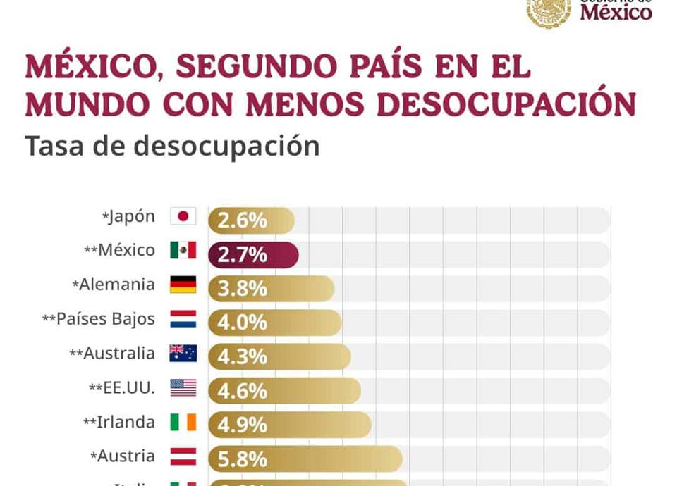 "La transformación da resultados", expresó Sheinbaum en sus redes sociales al compartir una gráfica de los países con menos desocupación.