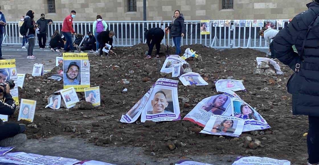 Con este lema, palas en mano, las fotos de sus seres queridos y montones de tierra, tres colectivos de familiares de desaparecidos recrearon el lunes ante el Palacio Nacional, sede de la presidencia de México, los enterramientos clandestinos que han proliferado en el país,.