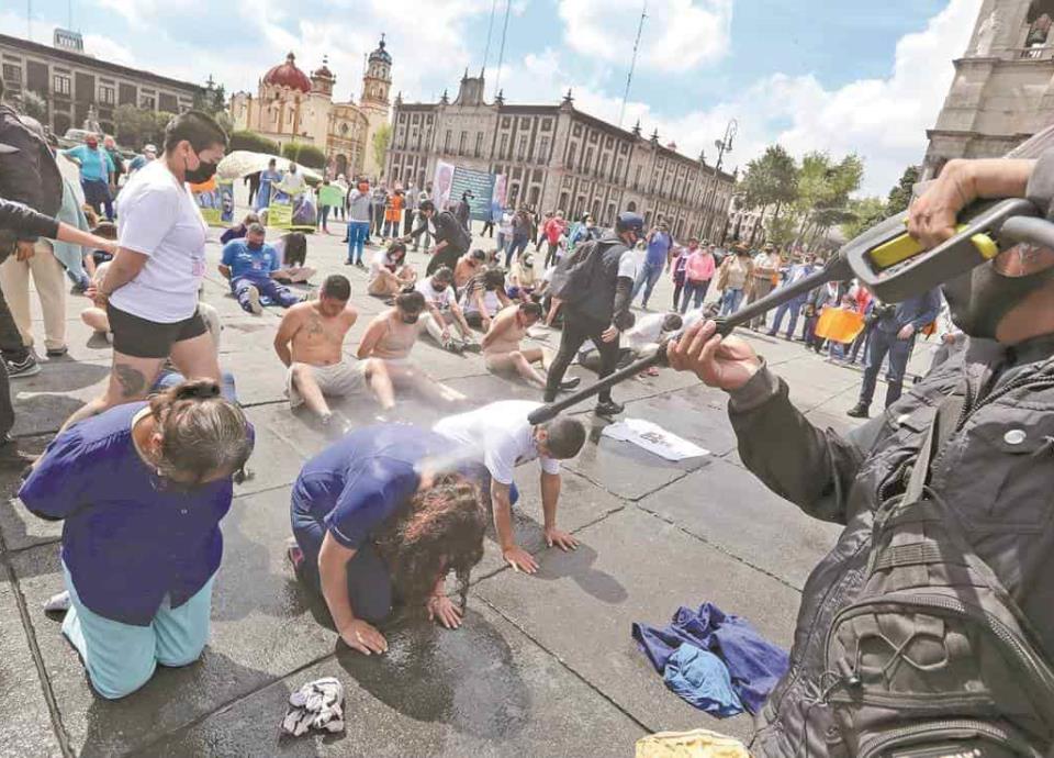 TOLUCA, Méx./EL UNI.- Para demandar la aplicación de la Ley de Amnistía a personas "injustamente" presas en el Estado de México, en la Plaza de los Mártires, más de 50 mujeres y hombres simularon uno acto tortura, que acusan, es de los más comunes en cárceles. Rapados, vestidos de color caqui o azul —como el uniforme de los internos— y de rodillas, tallaron con su playera el piso mientras recibían chorros de agua helada en la cabeza y espalda. Entre las filas caminaban algunos de los integrantes de la organización defensora de derechos humanos
