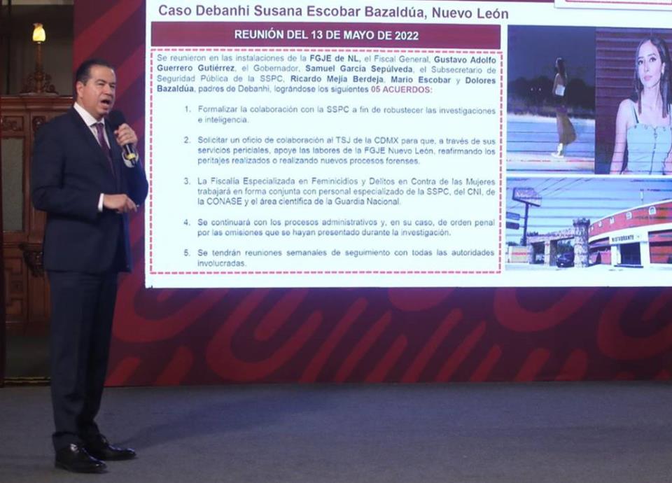 Señaló que ese mismo día se realizó la reunión donde estuvo la SSPC, el gobernador de Nuevo León, Samuel García; y el fiscal local, Gustavo Adolfo Guerrero, para buscar la colaboración del Tribunal Superior de Justicia de la Ciudad de México, la Comisión Nacional de Búsqueda y las instancias que fueran necesarias para revisar los dos dictámenes periciales de la autopsia de Debanhi.