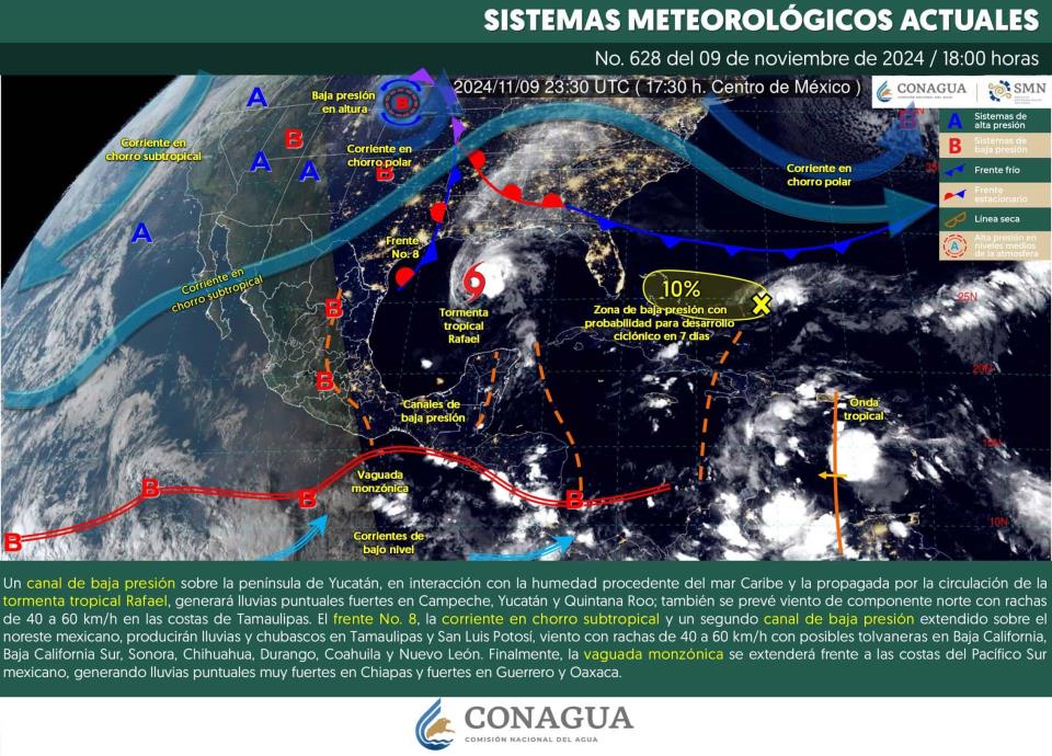 CIUDAD DE MÉXICO, noviembre 9 (EL UNIVERSAL).- El Servicio Meteorológico Nacional informó este sábado el avance de la tormenta tropical Rafael sobre el Golfo de México. El ciclón afectó esta semana el oeste de Cuba como un huracán categoría 3.