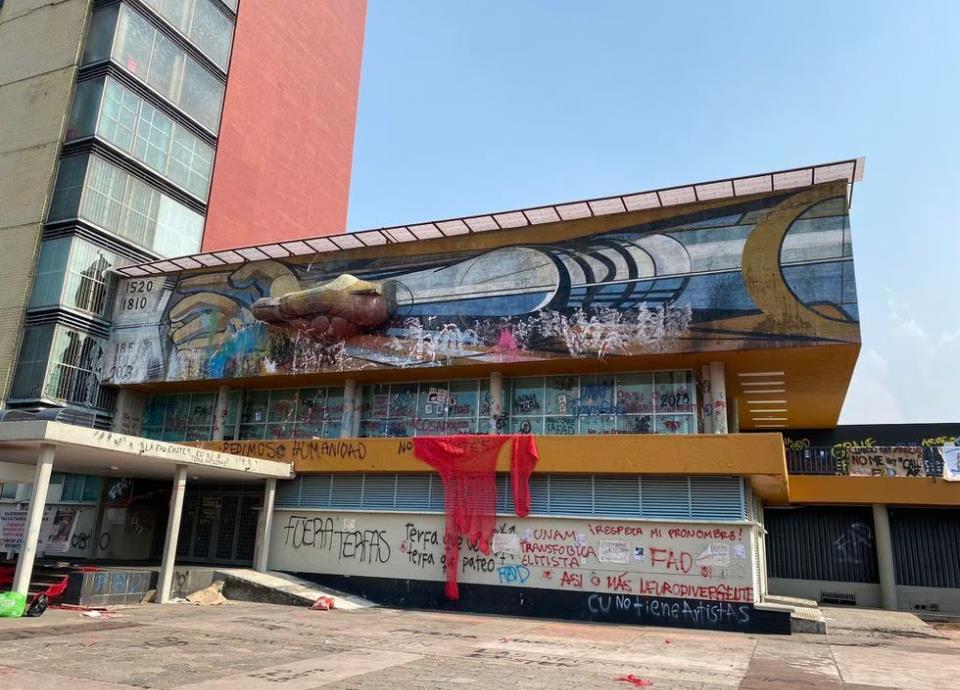 La UNAM informó a través de un comunicado que un contingente de unas 200 personas de la Facultad de Artes y Diseño, caminó por al campus y causó destrozos, además de vandalizar algunos edificios incluido el emblemático mural de David Alfaro Siqueiros.