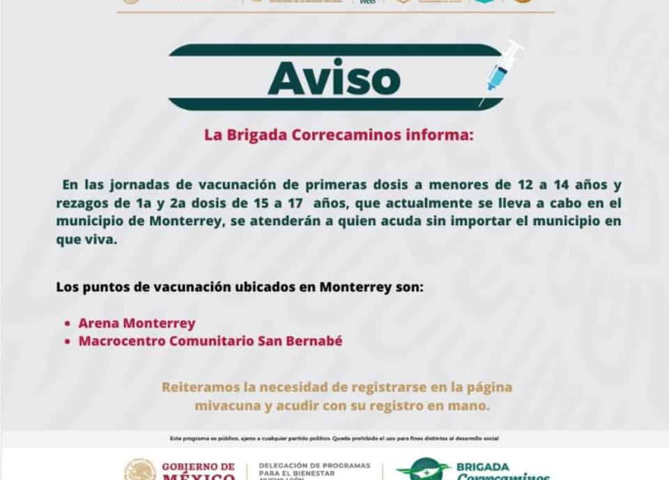 La Brigada Correcaminos informó que en la Jornada de Vacunación que se realiza actualmente en Monterrey, se atenderá a todos los menores que acudan sin importar el municipio del que acudan.
