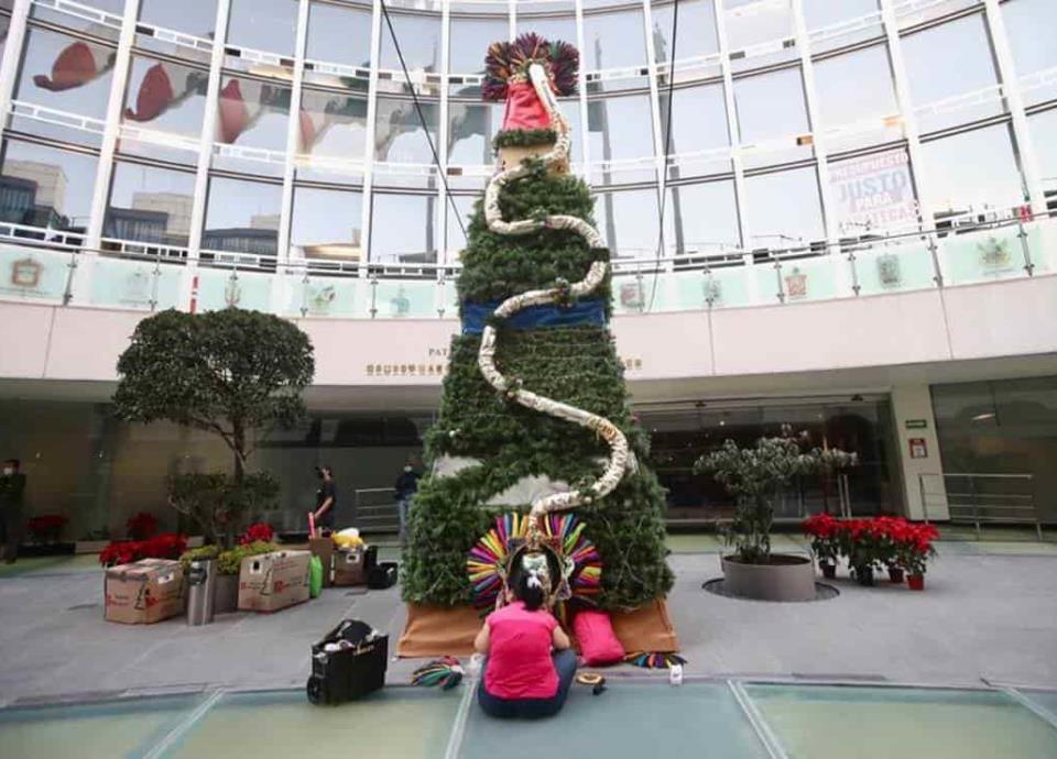 En el Patio del Federalismo, este martes instalaron un gran árbol de Navidad, pero en lugar de Estrella de Belén colocaron un penacho y, en lugar de escarcha, una serpiente y una imagen de Quetzalcóatl.