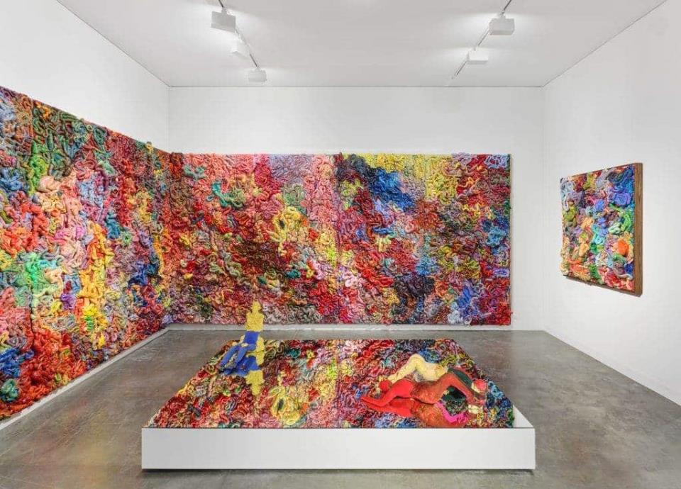 La oferta de Art Basel es variada. La feria está organizada por secciones: las centrales son Galleries y Meridians. La primera es la sección principal, donde se distribuyen 213 galerias; la segunda, integra obras de gran formato. En esta última, que tuvo 18 proyectos destaca por tercera ocasión la curaduría de Magalí Arreola, la directora del Museo Rufino Tamayo en la CDMX. "Tratamos de expandir los proyectos que se presentan para mostrar que el formato no es sólo una cuestión de escala", dice Arreola. Llama la atención una obra que recrea una escena urbana: tenis colgados sobre cables de luz. La pieza titulada The Grove (Devan Shimoyama, 2021) recrea calzado colgando de los cables de servicios públicos para evidenciar tanto los territorios de celebración y juego, como las zonas citadinas con mayores necesidades sociales y en las que la violencia también impone sus propias reglas de identidad.