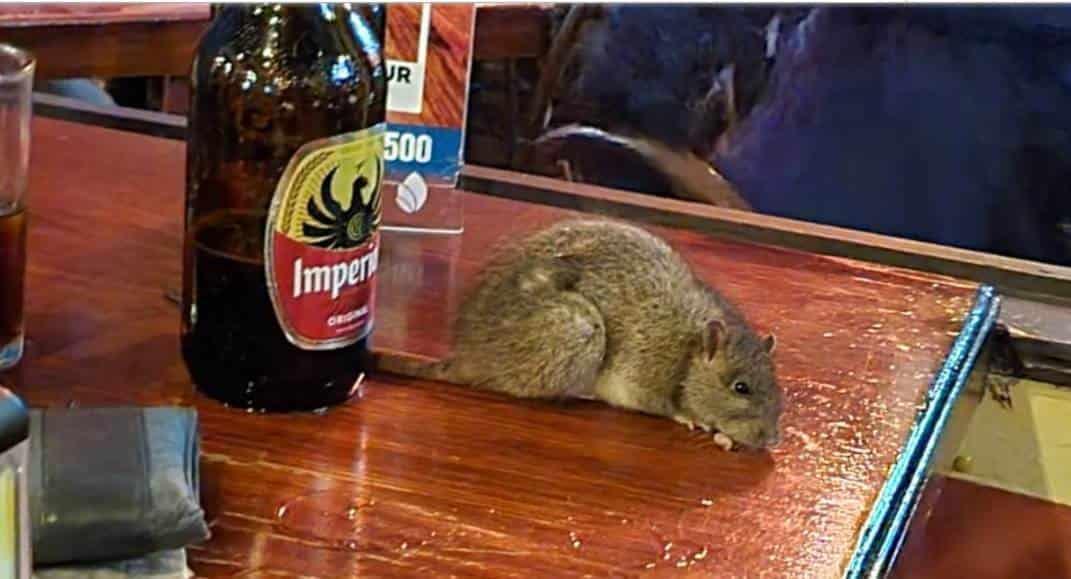 En Twitter se hizo viral una fotografía que muestra a una rata sobre una mesa entre envases de cerveza. Además, uno de los comensales captó en video el momento en que personal del local intentó sacar al roedor con una escoba, que se oponía totalmente a ser desalojado.