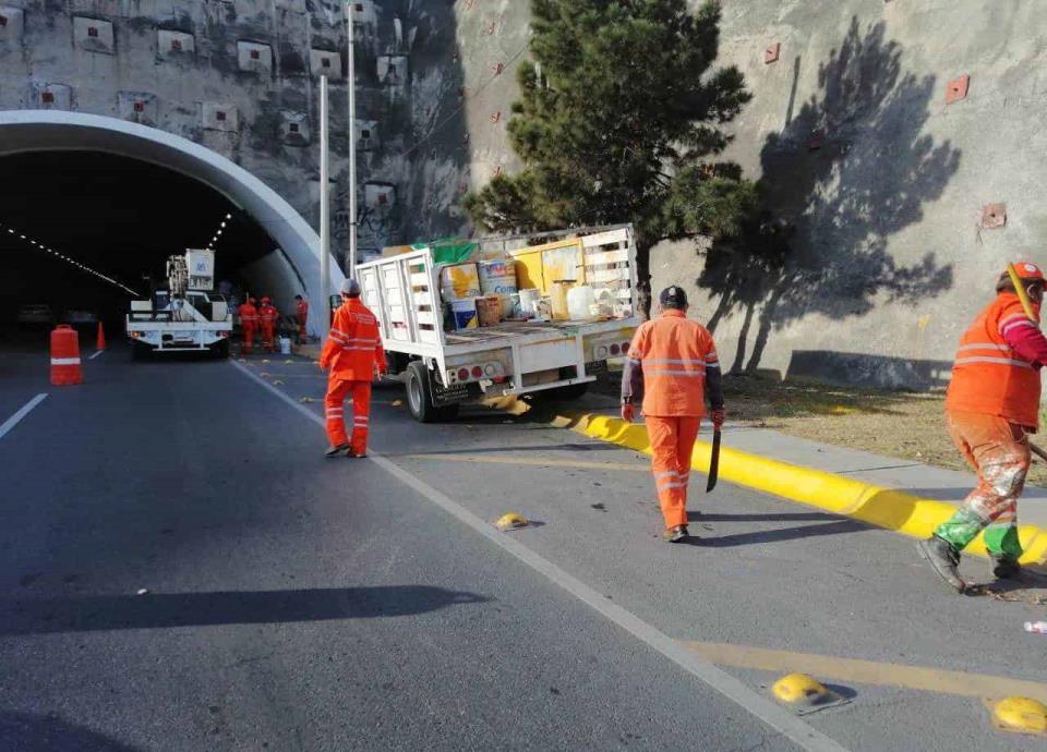 Monterrey, NL.-Con trabajos de mantenimiento integral, la Secretaría de Servicios Públicos de Monterrey atendió la parte correspondiente al municipio del Túnel de la Loma Larga, esto en su infraestructura vial y peatonal.