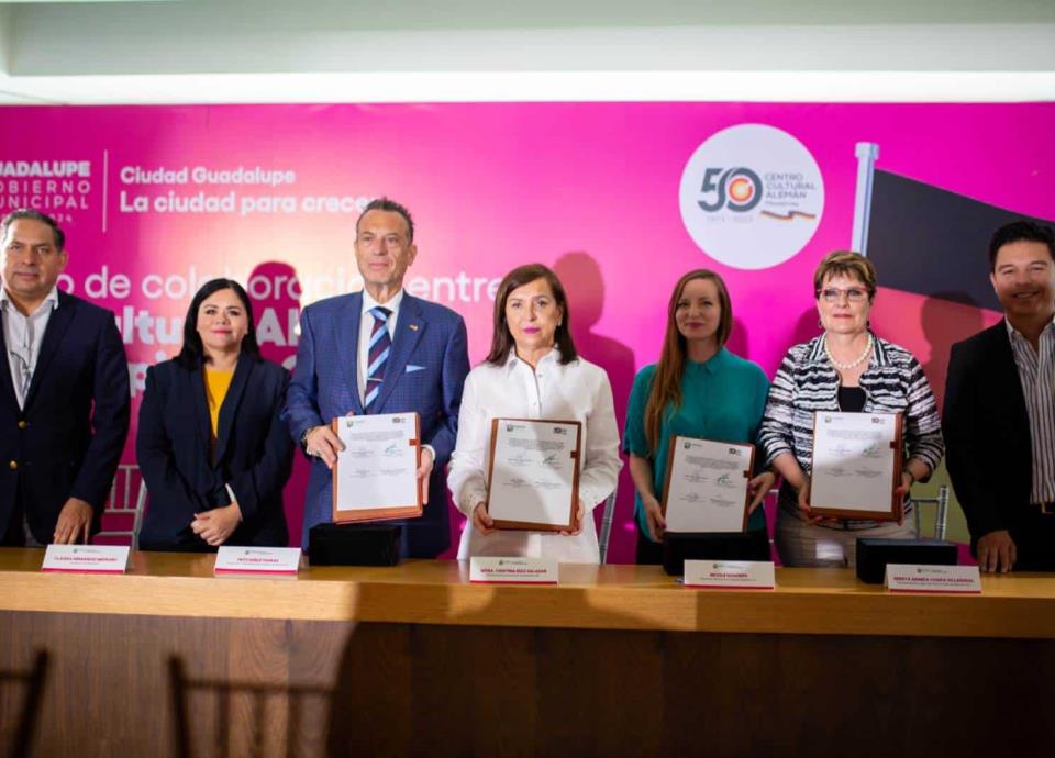 La firma de colaboración se llevó a cabo en el Estadio BBVA, y el Municipio de Guadalupe facilitará un inmueble para la instalación de una extensión del Centro Cultural Alemán, a fin de difundir la cultura del país europeo en diferentes actividades.