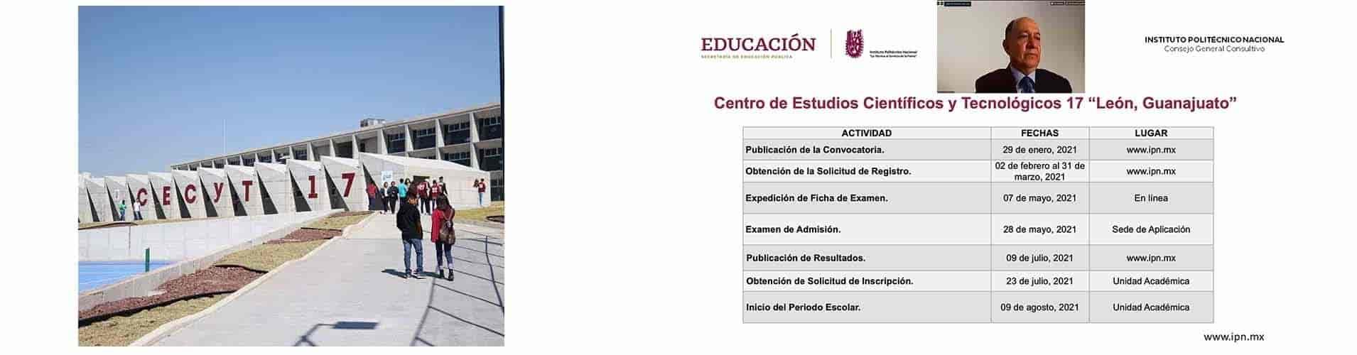 El Instituto Politécnico Nacional publicó la convocatoria para el Proceso de Admisión al Ciclo Escolar 2021-2022 para el Nivel Medio Superior, en Modalidad Escolarizada, del Centro de Estudios Científicos y Tecnológicos (CECyT) 17 “León, Guanajuato”, cuya oferta educativa está integrada por seis carreras.