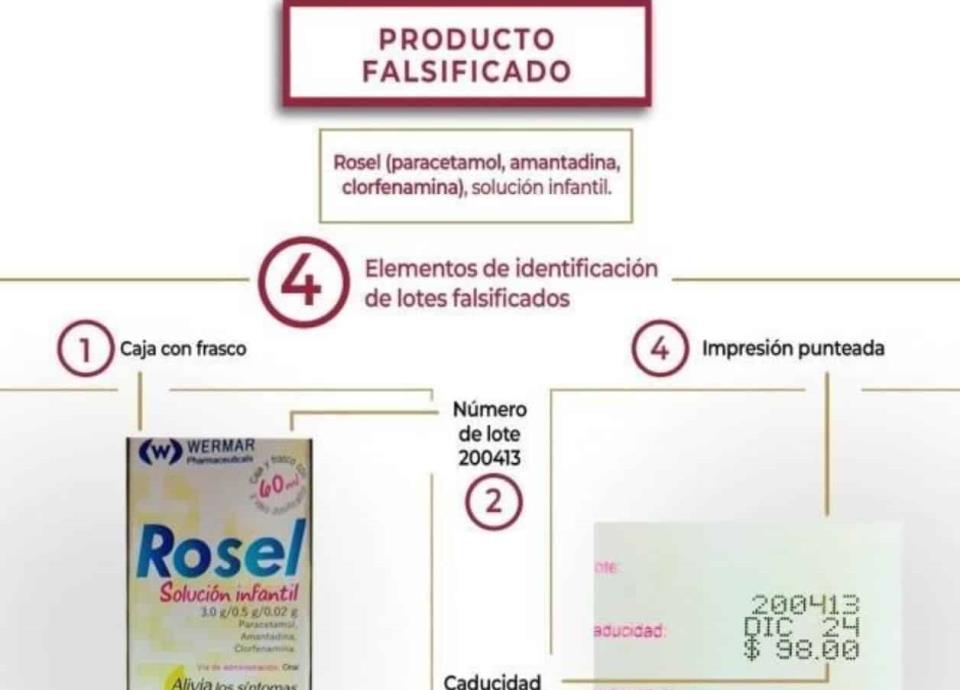 Se trata de los productos Rosel solución y Desenfriol-ito plus, por lo que la comisión federal recomendó no consumirlos. La Cofepris determinó la falsificación del producto Rosel (amantadina, clorfenamina, paracetamol) en presentación solución de 60ml, con el lote 200413, que ostenta fecha de caducidad de diciembre 2024, como resultado del análisis que realizó con base en la información presentada por la empresa Wermar Pharmaceuticals.