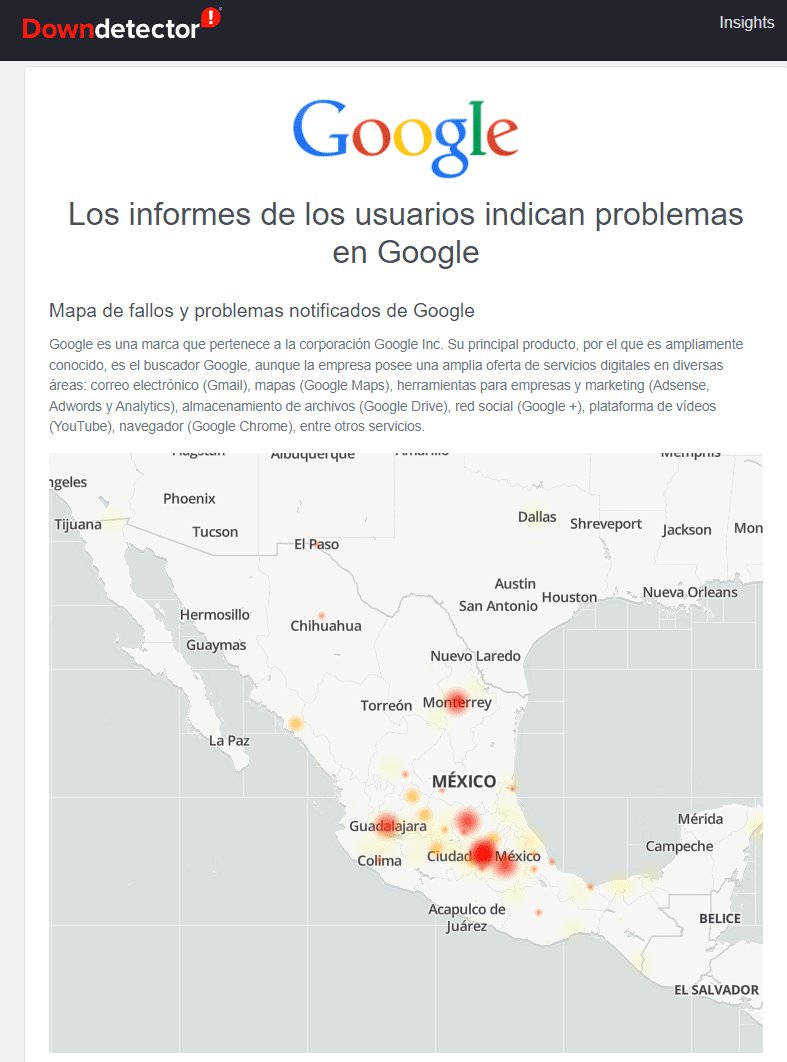 Un detalle importante de mencionar es que este fallo de Google parece estar limitado a México, pues DownDetector internacional no muestra reportes de caída de los servicios fuera de nuestro país, y DownDetector Mx solo muestra puntos críticos de fallas en territorio nacional.