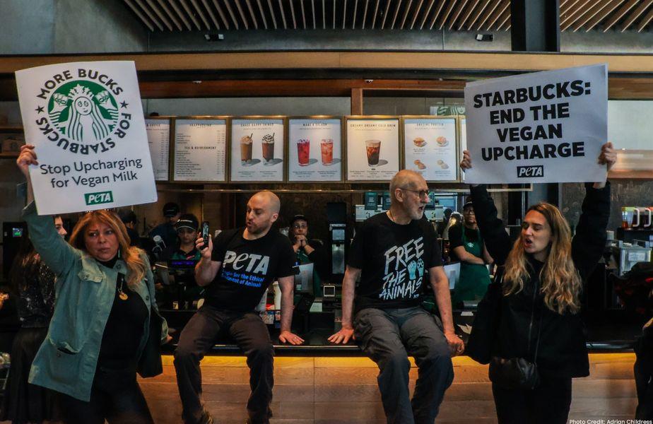 Cromwell se sentó en el mostrador de Starbucks con una camiseta que decía “Free the Animals” (Liberen a los animales) y leyó un comunicado denunciando el recargo por las alternativas veganas de leche.