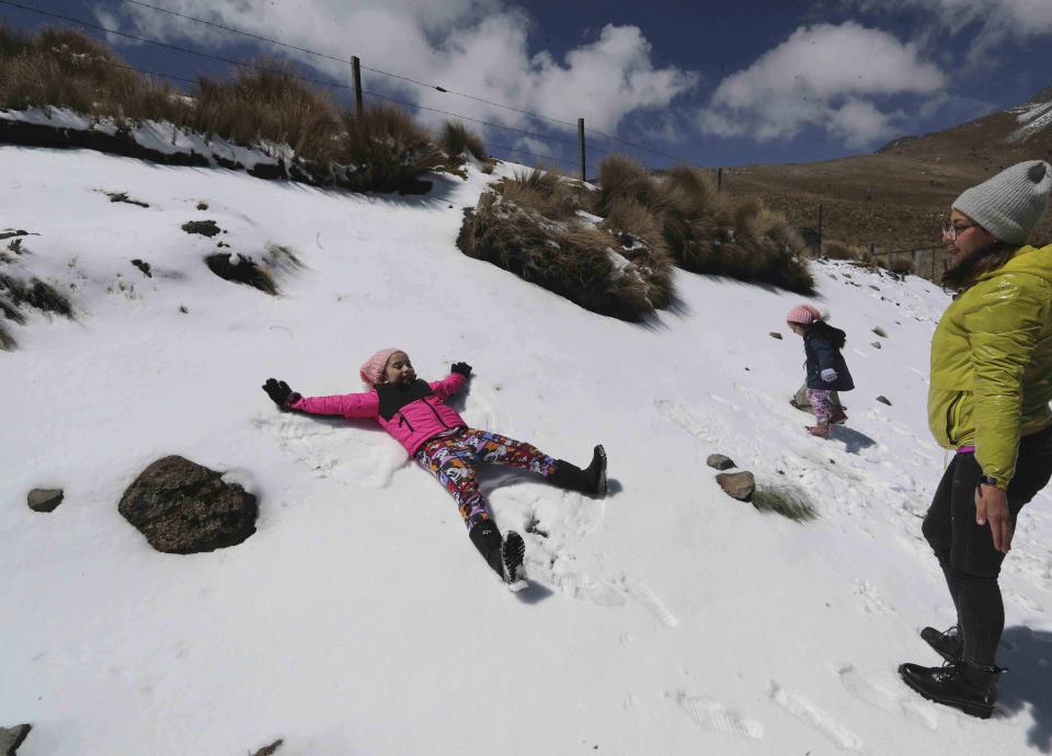 amaneció cubierto por una capa de nieve tras las lluvias registradas en los días recientes, sobre todo la noche del jueves, cuando las fuertes ráfagas de viento y el granizo generaron este panorama en la parte alta. Para los habitantes de la región fue una sorpresa, pues no esperaban ver esta imagen hasta dentro de varias semanas, cuando se prevé el inicio de las lluvias, pues por ahora el calor de la primavera prevalece. El paisaje ha atraído a los curiosos que llegan cubiertos con gorros, botas, chamarras, como es la recomendación para ascender al volcán por parte de las autoridades. Valentina Gallardo Sánchez es venezolana, tiene dos años de vivir en Toluca y por primera vez visitó el volcán, puesto que la imagen que regala cubierto de nieve es "maravillosa", opinó. En el parque hay decenas de familias haciendo angelitos de nieve, tumbados en el lugar, algunos explorando el lugar, puesto que quieren llegar a las lagunas de El Sol y La Luna. Laura Isabel Campos González, policía de Alta Montaña y Montada, hace un recorrido de verificación para descartar zonas de riesgo para los visitantes, pues si bien en la parte superior hay nieve, en algunos parajes se generan espejos de hielo que ponen en riesgo el paso de vehículos y visitantes a pie. Por lo que la mañana del viernes verificaron las condiciones y acordaron que no hay peligro para la llegada de turistas, a quienes les dan recomendaciones sobre la visita. Destacó que lo primordial que debe conocer la gente son los síntomas del mal de montaña que concentra una serie de malestares por la altura, pues hay gente que no se adapta a ella y presenta dolor de cabeza, zumbido de oídos, desmayo; en esos casos le piden que la persona haga un alto total, mientras está consciente, porque permite bajar el ritmo cardíaco y que se habitúe a paso lento. "De no mejorar, lo mejor es bajar". En la zona del Parque Nevado de Toluca fue desplegado el agrupamiento con instrucción para atender a los turistas y tras una valoración, se contactan con el Servicio de Urgencias del Estado de México (SUEM) o un helicóptero de Relámpagos, según sea necesario. Por ahora hay 20 efectivos en el lugar y la policía recomendó a la población que antes de ascender, consulten si hay paso, pues cada mañana se define si existen las condiciones adecuadas para realizar el ascenso.
